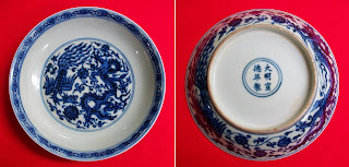 大明宣德年製官窯青花五爪龍鳳纏枝蓮花卉紋盤與台北故宮博物院藏大明宣德年製青花龍鳳紋盤 A Blue and White Five-Claws Dragon and Phoenix Lotus Dish Imperial Palace Workshop Xuande Period Ming Dynasty and the same Dish collected in the Taipei National Palace Museum